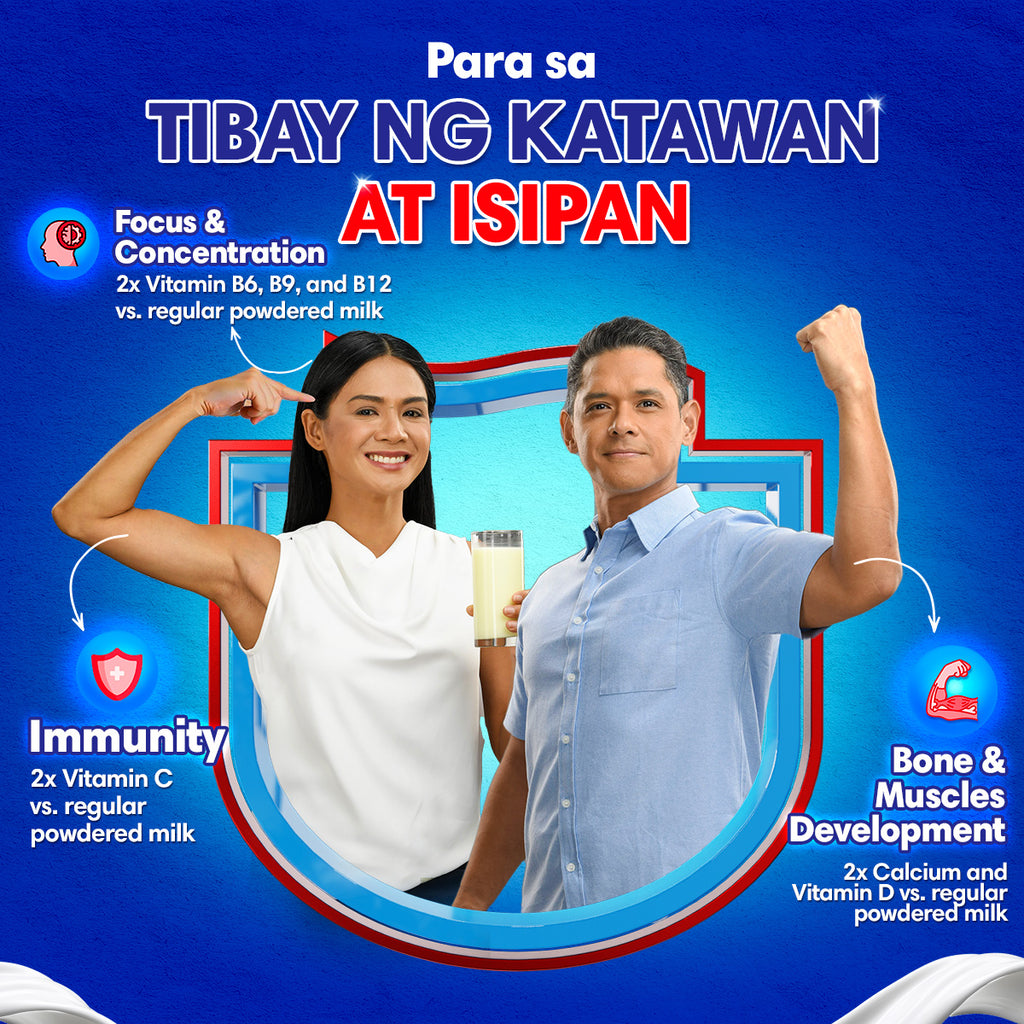 Our product is specially designed with age-adjusted Tibay Nutrients to help meet 100% of adults' daily essential nutritional needs. It contains Tibay Katawan Nutrients Vitamin C, D, Calcium, and Protein) for strong bones, muscles, and immunity. It also has Tibay Isipan Nutrients (Vitamins B6, B9, and B12) for focus and concentration, as well as Taurine which helps in brain function.