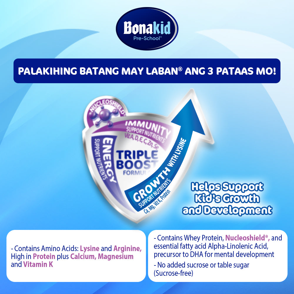 'Pag 3 pataas na ang anak mo, marami siyang haharapin na Laban araw-araw. Palakihin siyang may Laban ng Katawan with BONAKID PRE-SCHOOL 3+, may Triple Boost Formula na sadyang ginawa para mabigyan ng sapat na nutrisyon ang mga batang Pilipino na 3 Pataas. Together with a varied, balanced diet and healthy lifestyle, ang mga Growth, Energy at Immunity Nutrients na ito ay tumutulong para lumaki ang anak mong Batang May Laban. Palakihing may Laban ng Katawan ang 3 Pataas mo!