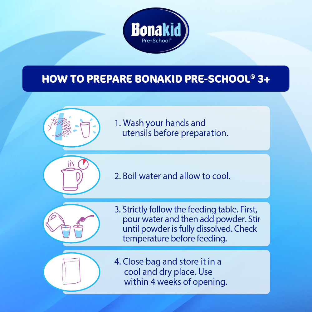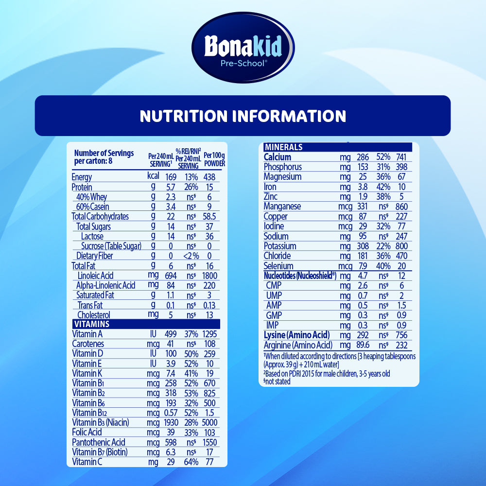 BONAKID PRE-SCHOOL® 3+ also contains whey protein, essential fatty acid Linolenic acid and no added sucrose (table sugar).