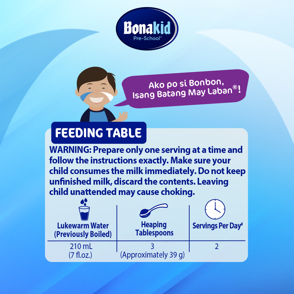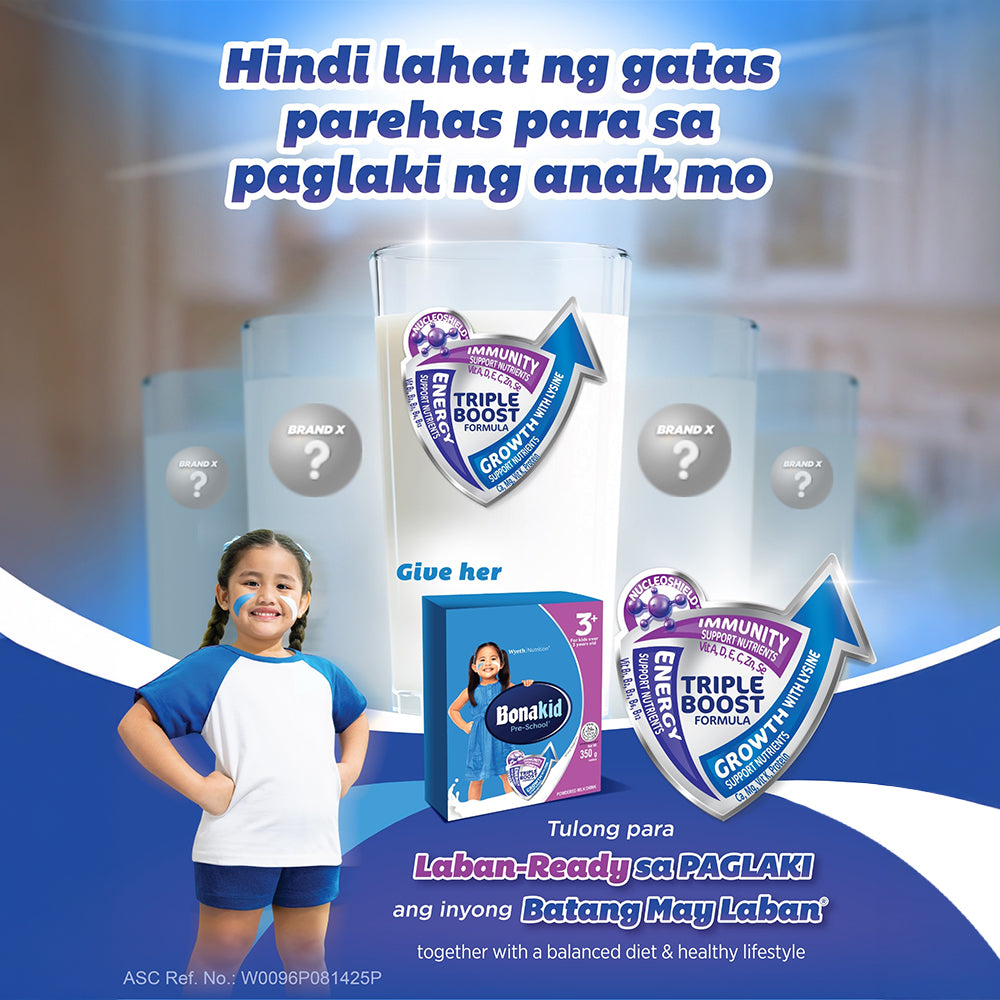 The NEW & IMPROVED BONAKID PRE-SCHOOL® 3+ now with 20% more Calcium & Lysine (vs previous formulation!). With Triple Boost Formula, Bonakid Pre-School 3+ is filled with nutrients that boost your child's immunity, growth, and energy upang maging Batang May Laban na Laban-Ready sa Paglaki ang anak mong 3 years old and up.