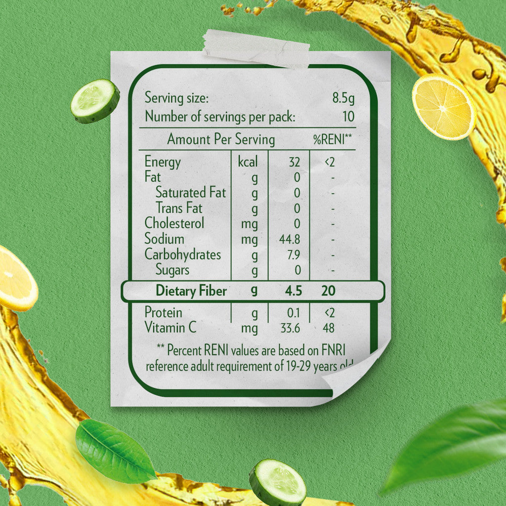 • Ingredients: Inulin Fiber, Acidity regulators (Citric acid, Trisodium citrate), Green tea powder (4%), Flavors, Sweeteners (Aspartame*, Acesulfame potassium), Cucumber extract (1%), Lemon extract (0.9%), Vitamin C